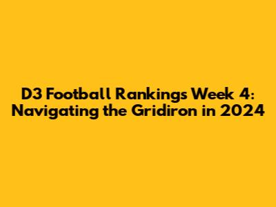 Hey football fanatics! Week 4 of the D3 football season is upon us, and the gridirons are sizzling with action! We're talking about a whirlwind of upsets, nail-biting finishes, and the constant reshuffling of the D3 football rankings. This year's competition is shaping up to be one for the books, with teams battling it out for those coveted playoff spots. As we dive into the latest rankings, let's break down the top contenders, potential dark horses, and what you can expect from the thrilling Week 4 matchups. Get ready for some serious football analysis, guys â this is where the excitement kicks into high gear!
